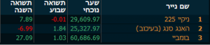 באסיה רשמו המדדים המובילים מגמת מסחר חיובית, כאשר בסיכום השבוע מדד הניקיי היפני ירד ב- 0.01%, מדד המניות בשנחאי עלה ב- 1.36%, מדד ההאנג סנג עלה ב- 1.84% ומדד המניות בהודו עלה ב- 1.03%.