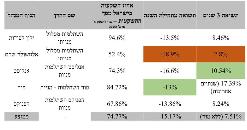 כפי שניתן לראות החשיפה הנמוכה ביותר לנכסים מקומיים, בישראל, נמצאת אצל אלטשולר שחם שמציג עד כה את הביצועים הנמוכים מתחילת השנה ובשלוש השנים האחרונות. חשוב לציין כי עד לפני כחצי שנה, בית ההשקעות הציג דווקא את הביצועים הטובים ביותר בשלוש השנים האחרונות. השינוי הדרמטי מקורו בביצועי החסר של השווקים הגלובליים מתחילת השנה ובמיוחד של וול-סטריט לעומת הבורסה בת”א. החשיפה הגדולה להשקעות בחו”ל הורידו את אלטשולר לתחתית הטבלה.