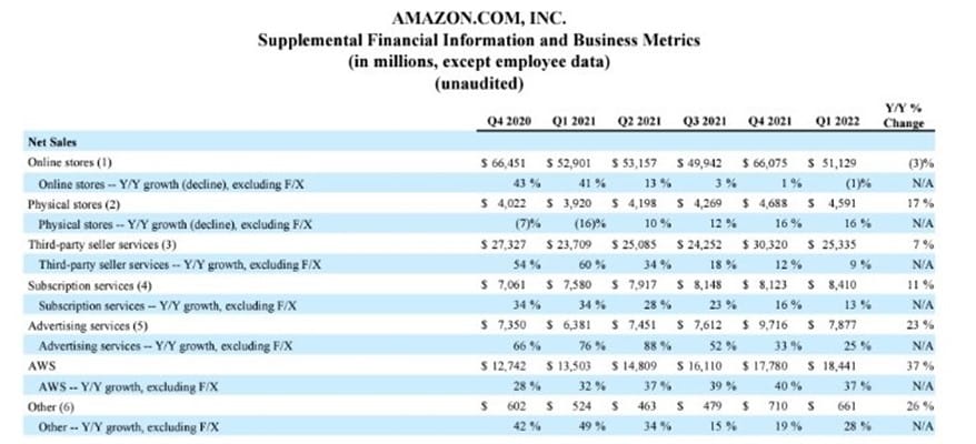 השורה הראשונה מצביעה על מכירות של 51.1 מיליארד דולר בחנויות אונליין, ירידה קלה של 3% לעומת הרבעון המקביל אשתקד. הנתון שאיכזב את המשקיעים עם פרסום הדוחות האחרונים ושלח את המניה לירידות. לאחר מכן ישנו נתון על מכירות בחנויות פיזיות שעמד על 4.6 מיליארד דולר, נתון פחות מהותי לעת עתה לעסקי החברה.